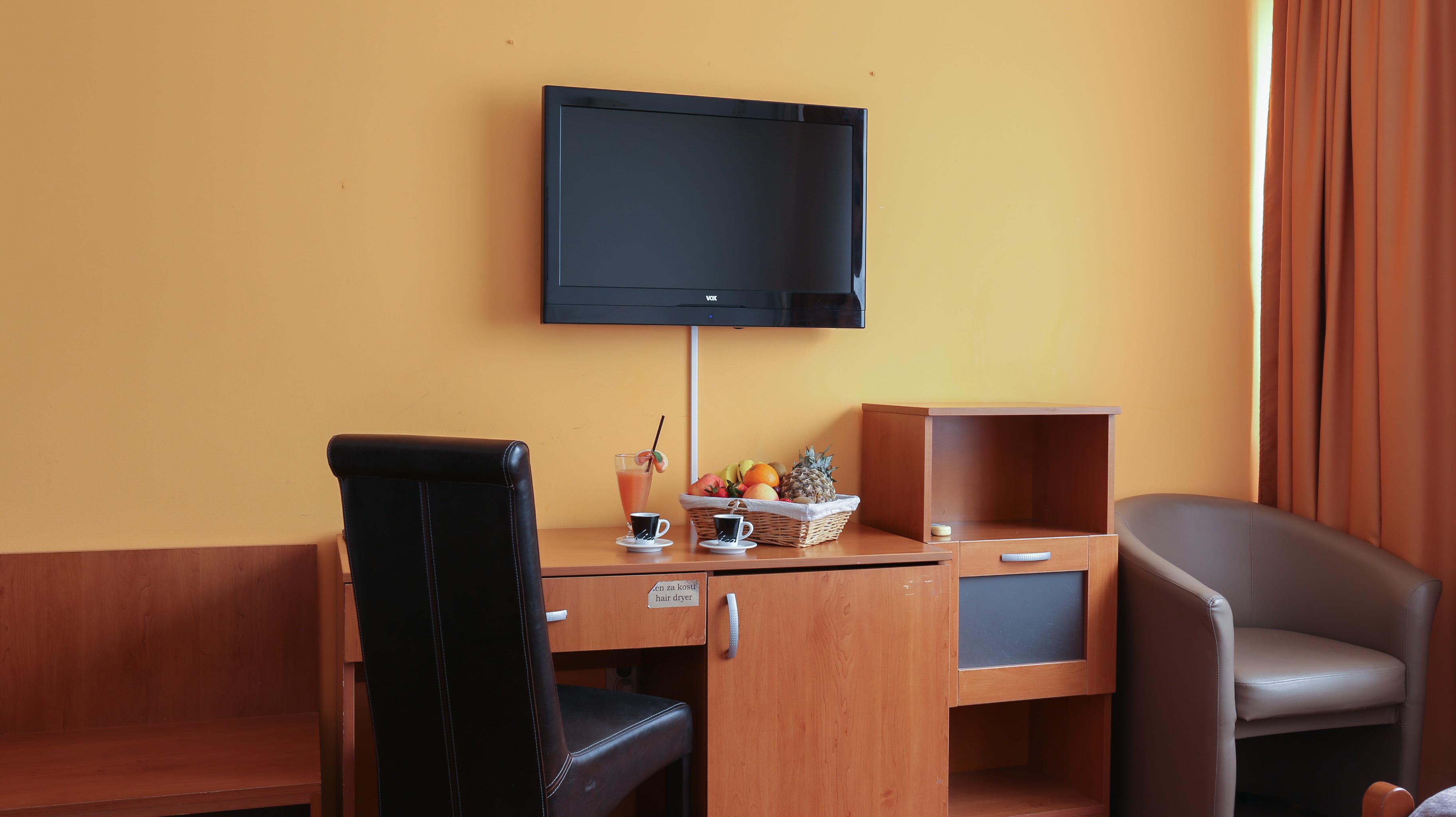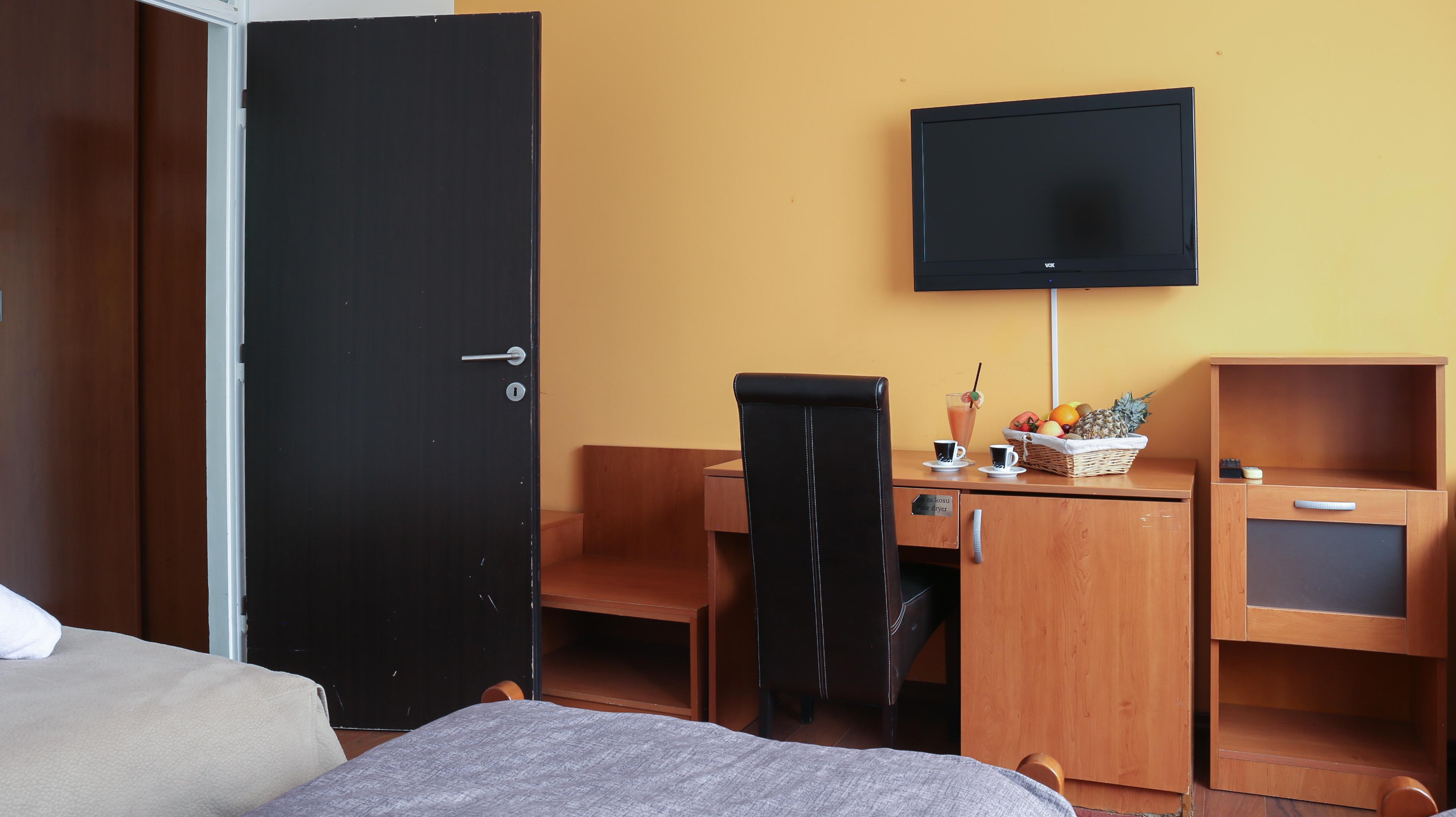 Dvokrevetna soba sa pomoćnim ležajem dimenzija 21 m² je idealna za porodice sa decom ili grupe gostiju. Soba je opremljena klima uređajem, frižiderom, ormanom, radnim stolom, noćnim ormarićem, Wi-Fi-jem i TV-om sa kablovskim kanalima. Kupatilo je opremljeno tuš kabinom, fenom za kosu i osnovnim toaletnim priborom za udoban boravak.